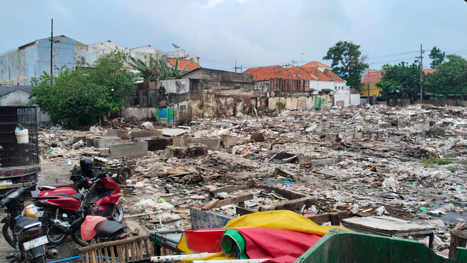“Limbah-limbah iki ya kerja bakti dewe arek-arek (limbah-limbah ini ya kerja bakti sendiri anak-anak/pedagang),” keluhnya.