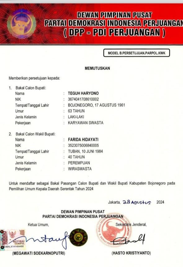 Surat rekomendasi yang beredar di kalangan wartawan telah ditandatangani langsung oleh Ketua Umum DPP PDIP Megawati Soekarnoputri dan Sekretaris Jenderal Hasto Kristiyanto tertanggal 28 Agustus 2024.