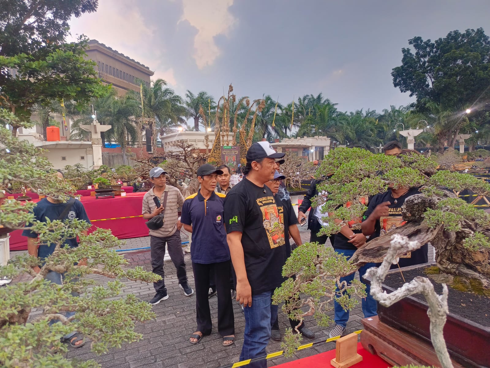 Hadir sederhana dengan setelan kaos hitam, celana jeans dengan topi putih di kepalanya, ia bersama dengan beberapa timnya menengok satu persatu ratusan tanaman bonsai yang dijejer dalam kontes tersebut.