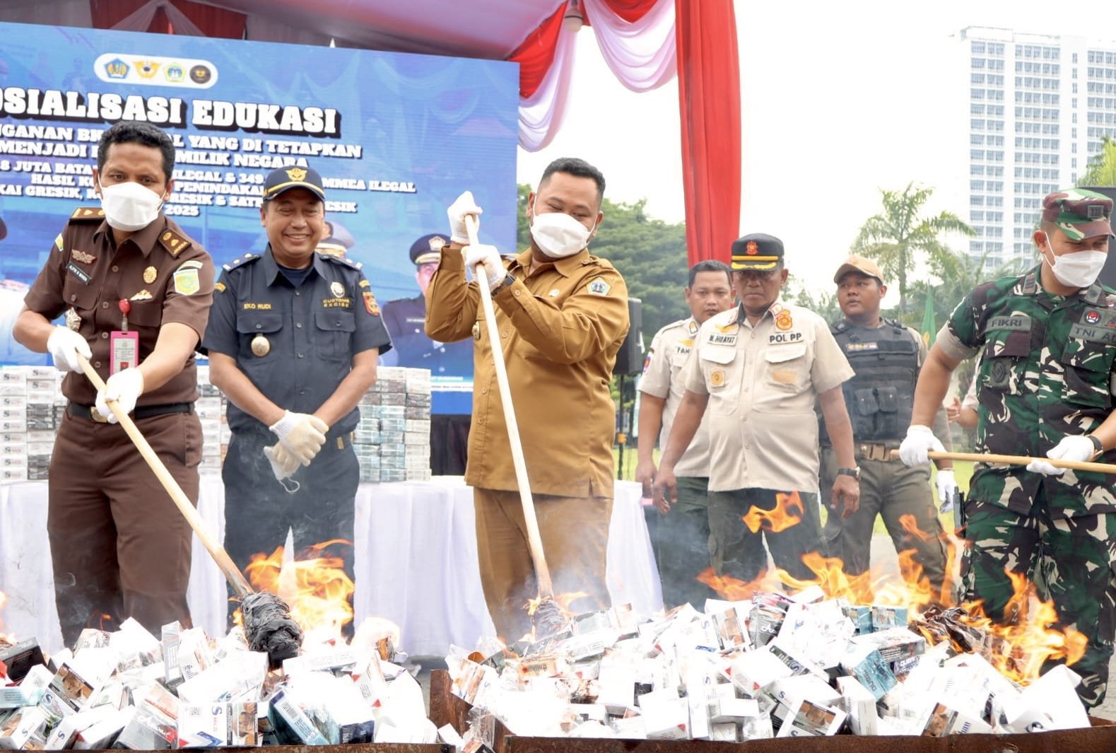 Bupati Gresik Fandi Akhmad Yani memimpin langsung pemusnahan 9.863.502 batang rokok ilegal dan 349,2 liter MMEA ilegal. Hasil operasi gabungan Satpol PP Gresik, Bea Cukai Gresik, serta unsur penegak hukum lainnya ini berhasil menyelamatkan potensi kerugian negara sebesar Rp9,63 miliar.