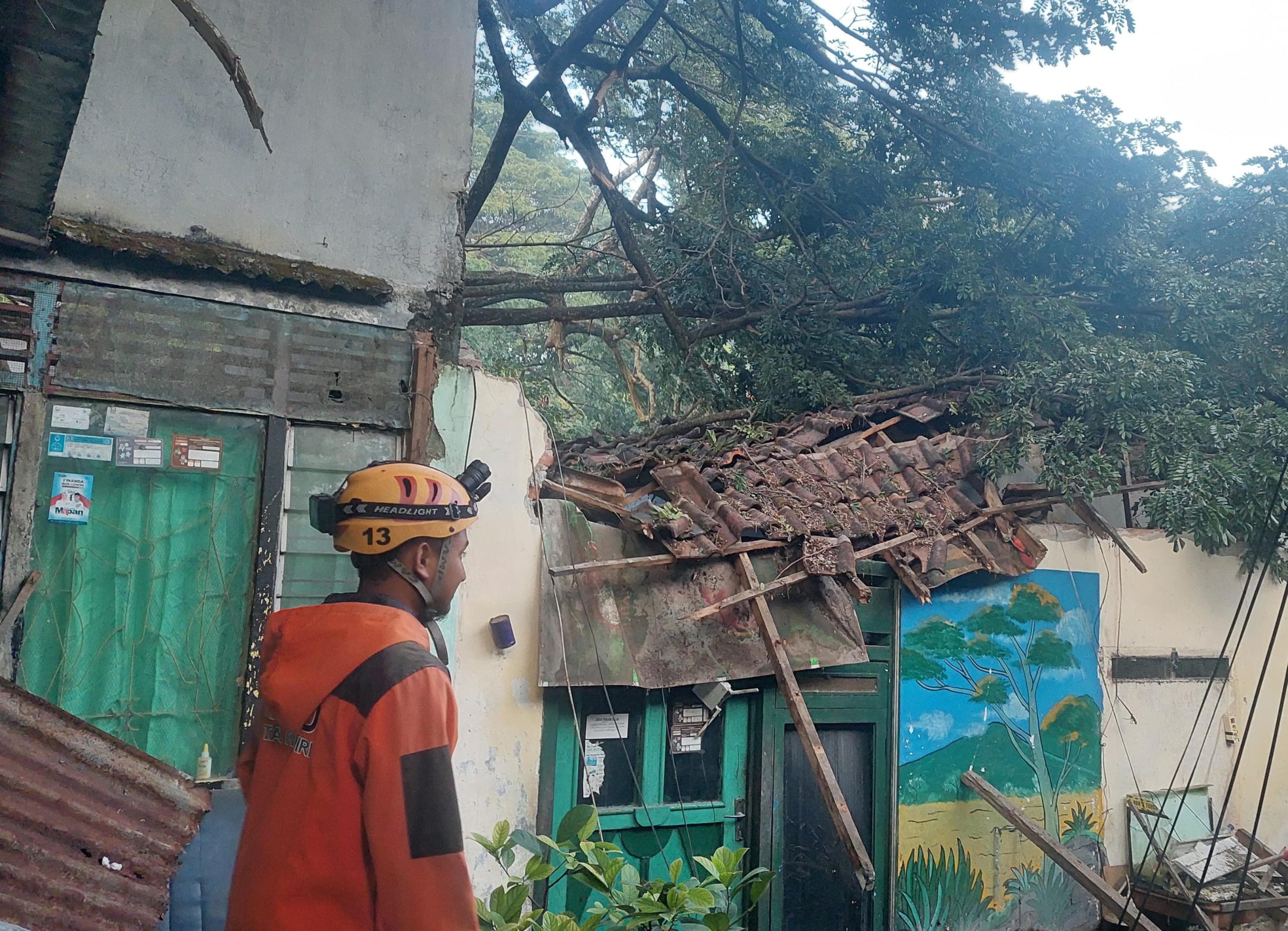Pohon tersebut menimpa dua rumah warga hingga rusak berat. Keduanya milik Huda dan Imron.