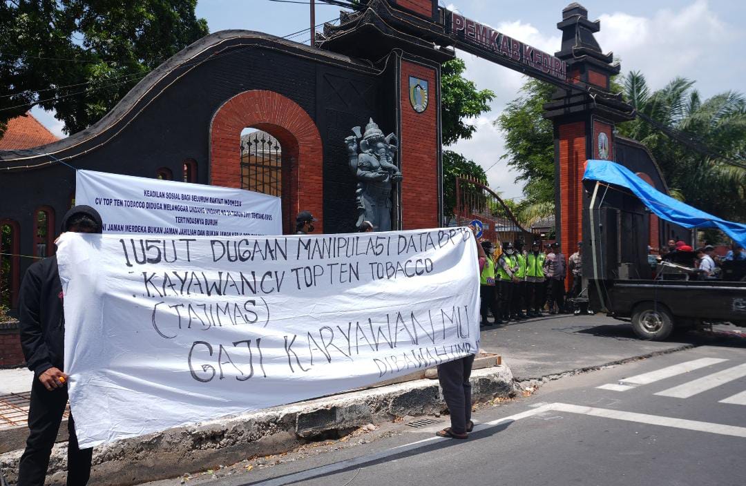 KabarBaik.co – Aliansi Masyarakat Mencari Keadilan (MACAN) menggelar aksi di Kantor Pemerintah Kabupaten (Pemkab) Kediri, Selasa (22/10). Ini merupakan aksi tang ketiga kalinya ini untuk menindaklanjuti dugaan manipulasi data karyawan perusahaan CV Top Ten Tobacco atau pabrik rokok Tajimas.
