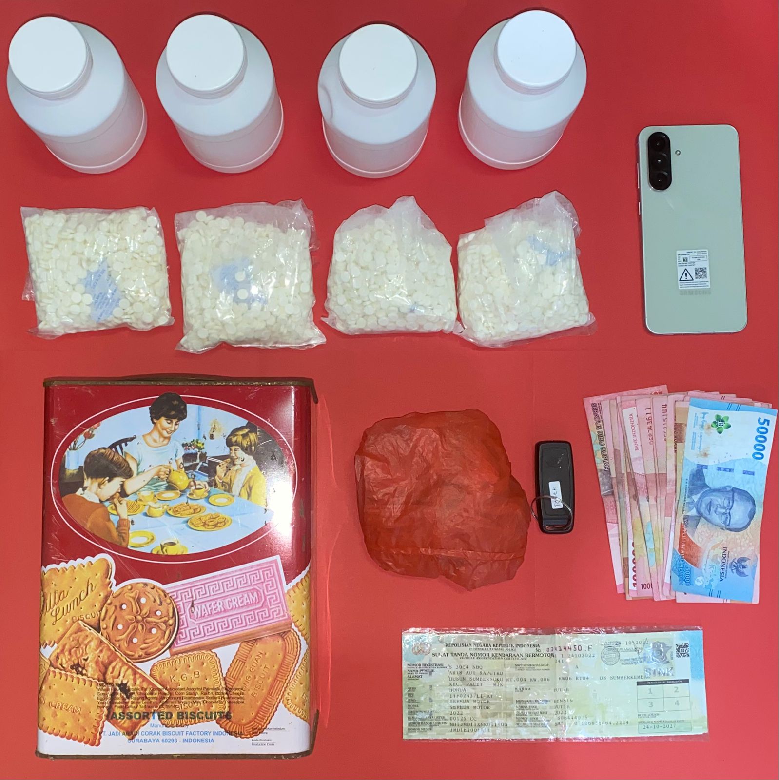 Dari lokasi, petugas menyita 4.000 butir pil Double L yang dikemas dalam empat botol plastik putih, masing-masing berisi 1.000 butir. Selain itu, polisi juga mengamankan uang tunai Rp 1.650.000 yang diduga hasil penjualan, satu unit ponsel, dan sepeda motor Honda Vario.