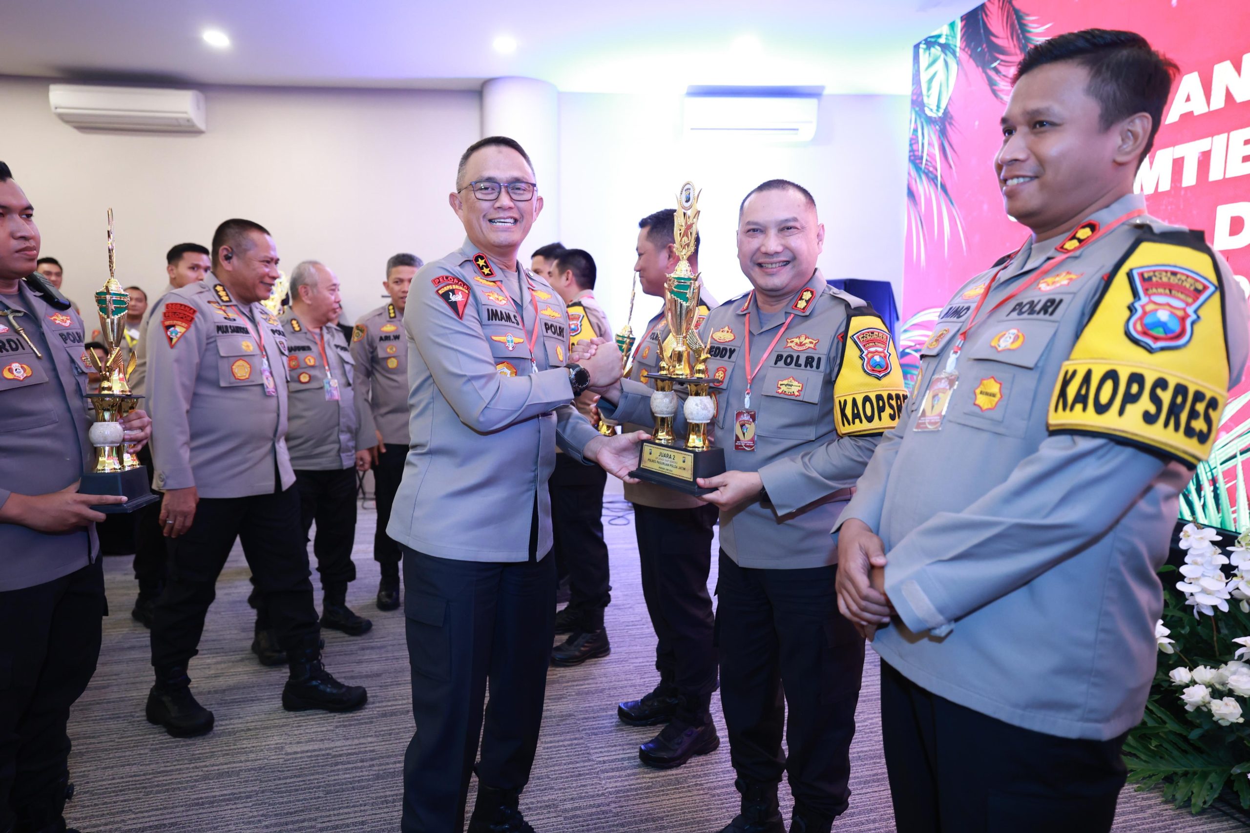 Kapolres Pasuruan AKBP Teddy Chandra menerima penghargaan dari Kapolda Jatim Irjen Pol Imam Sugianto. (Foto: Zia Ulhaq)