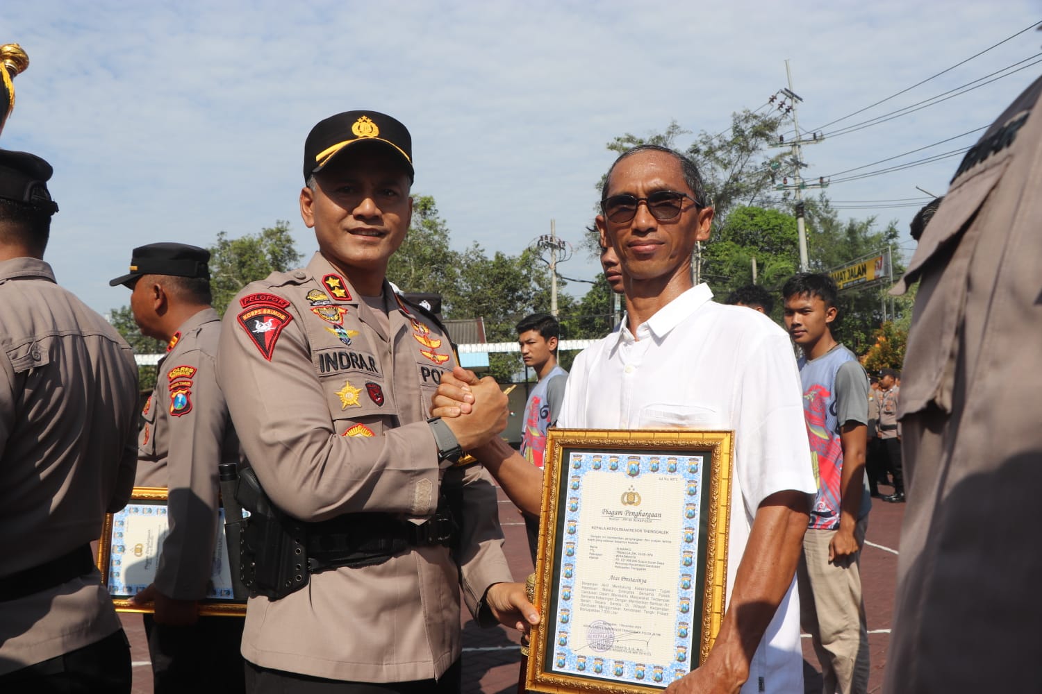 Kapolres Trenggalek AKBP Indra Ranu Dikarta memberikan piagam penghargaan. (Foto: Herlambang)
