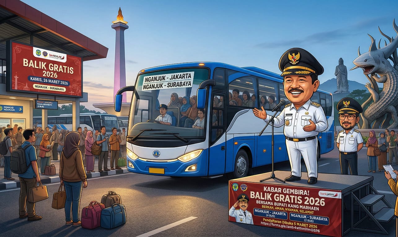“Kami memahami bahwa arus balik seringkali menjadi tantangan tersendiri bagi warga, baik dari sisi biaya maupun kenyamanan transportasi. Dengan adanya Balik Gratis ini, kami ingin memastikan warga Nganjuk bisa kembali ke Jakarta atau Surabaya dengan selamat dan bahagia. Semangatnya adalah ‘Balik Nyaman, Aman, dan Gratis’,” tutur Bupati Nganjuk Marhaen Djumadi, Selasa (3/3)