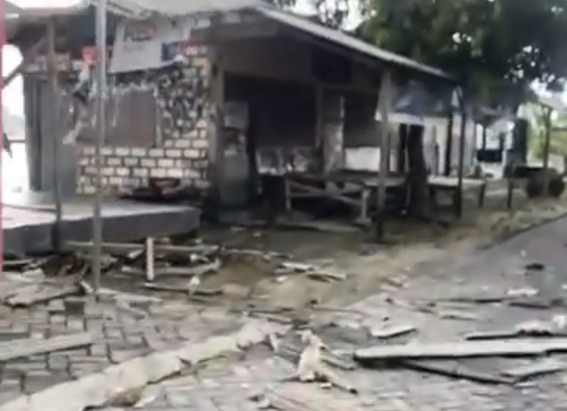 Puting beliung muncul secara tiba-tiba. Pusaran angin ribut itu bergerak merusak bangunan-bangunan di tepi jalan dan area pertambakan.