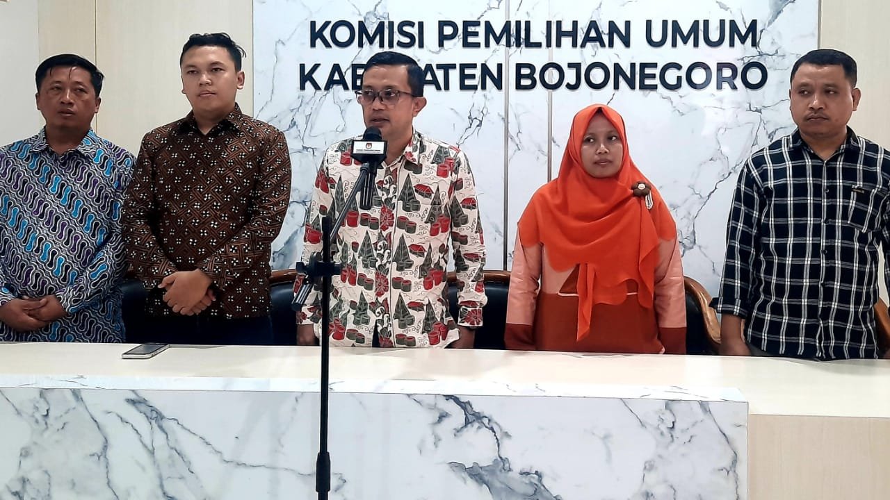 Komisioner KPU Bojonegoro melakukan konferensi pers hari pertama pendaftaran calon bupati dan wakil bupati. (Foto: Shohibul Umam)