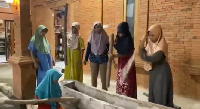 Salah satu yang paling mencolok adalah tradisi menabuh lesung. Sejumlah perempuan lanjut usia memukul lesung kayu menggunakan alu dengan irama khas. Bunyi tabuhan terdengar bersahut-sahutan, memecah malam yang temaram.