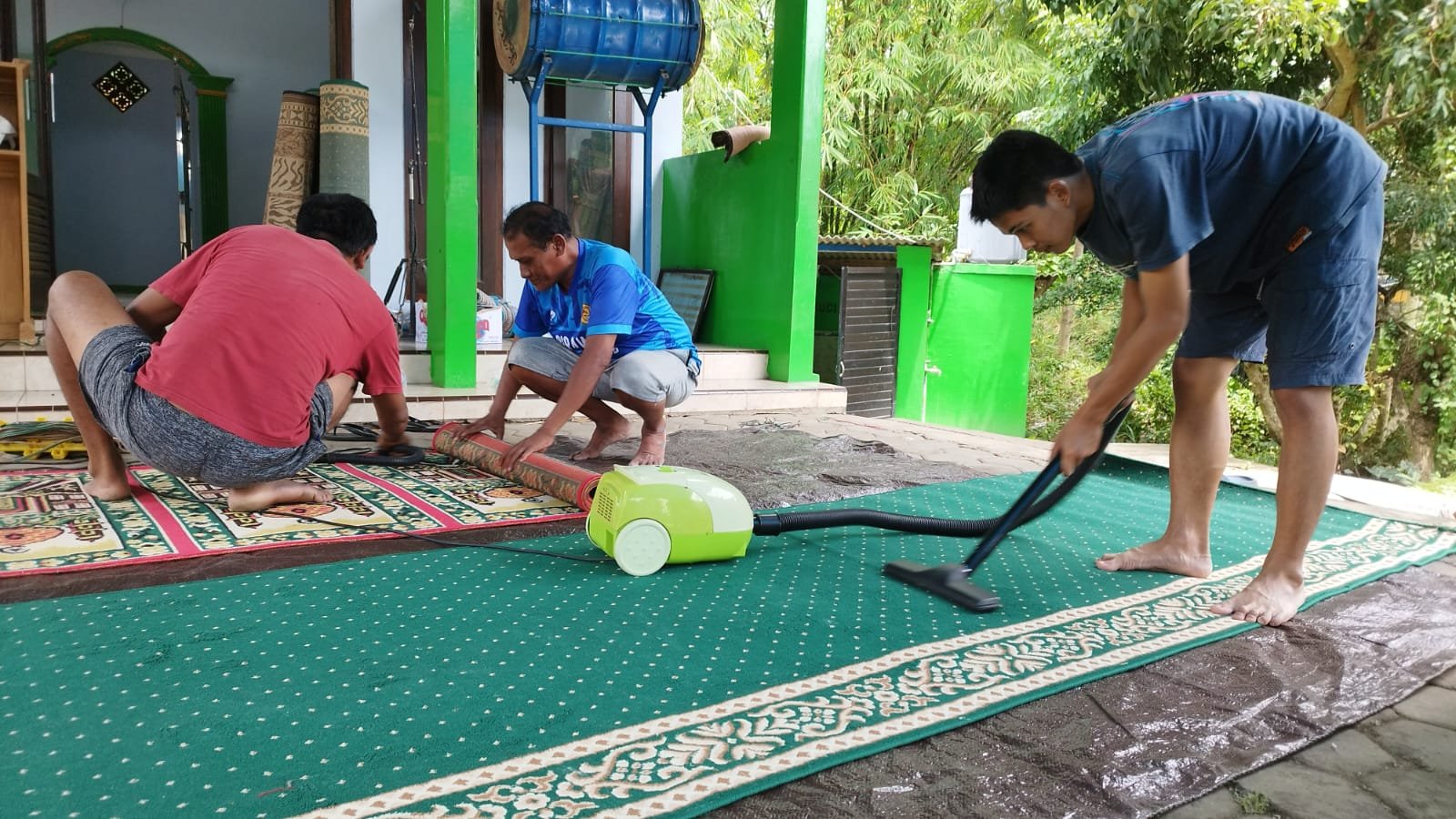 Mereka membersihkan lantai, karpet, hingga menata ulang perlengkapan salat untuk menyambut bulan suci.
