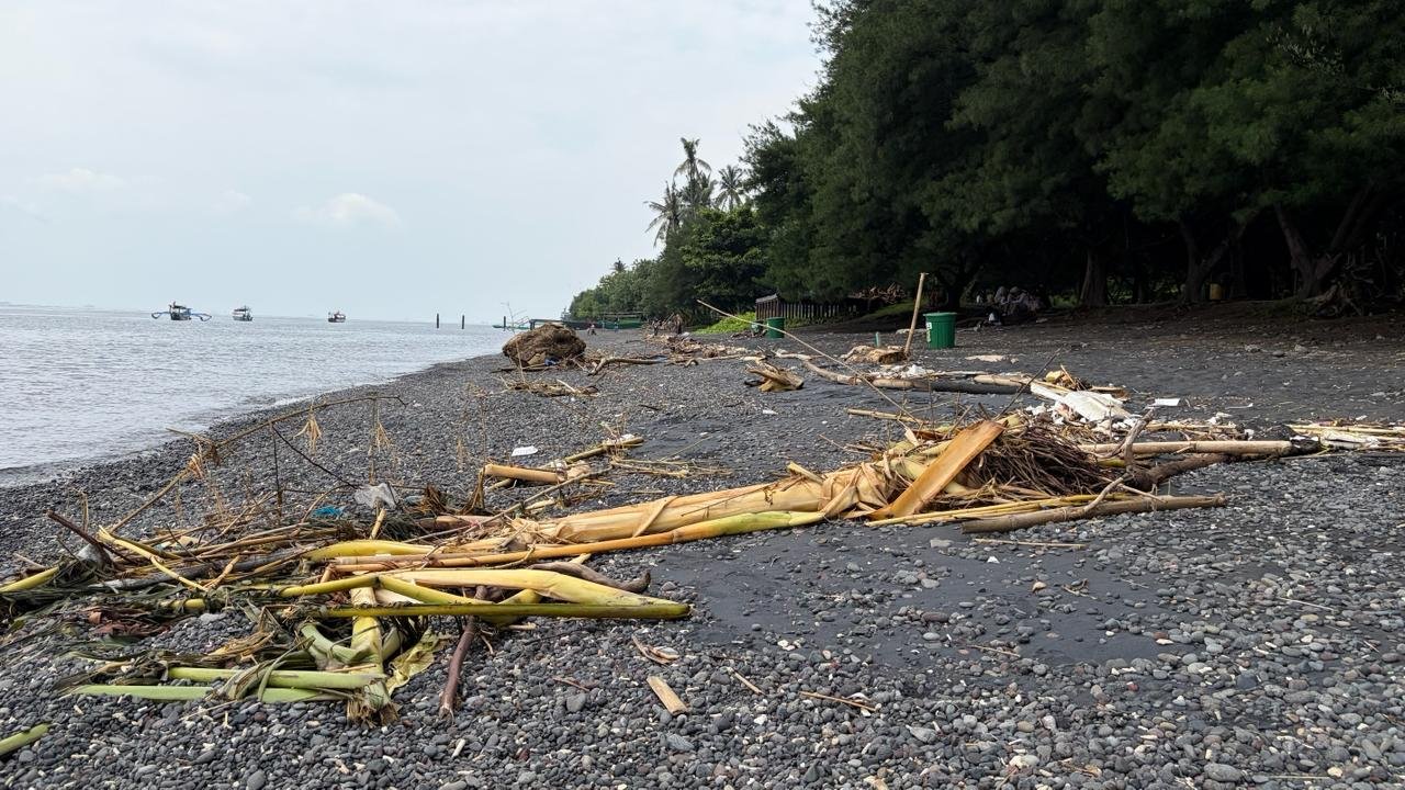 Menurut Azis, material sampah yang mendominasi berupa kayu gelondongan, bambu, serta ranting pohon. Kondisi itu mengindikasikan bahwa sampah berasal dari kawasan hulu yang terbawa arus sungai hingga ke laut, lalu terdampar di pantai.