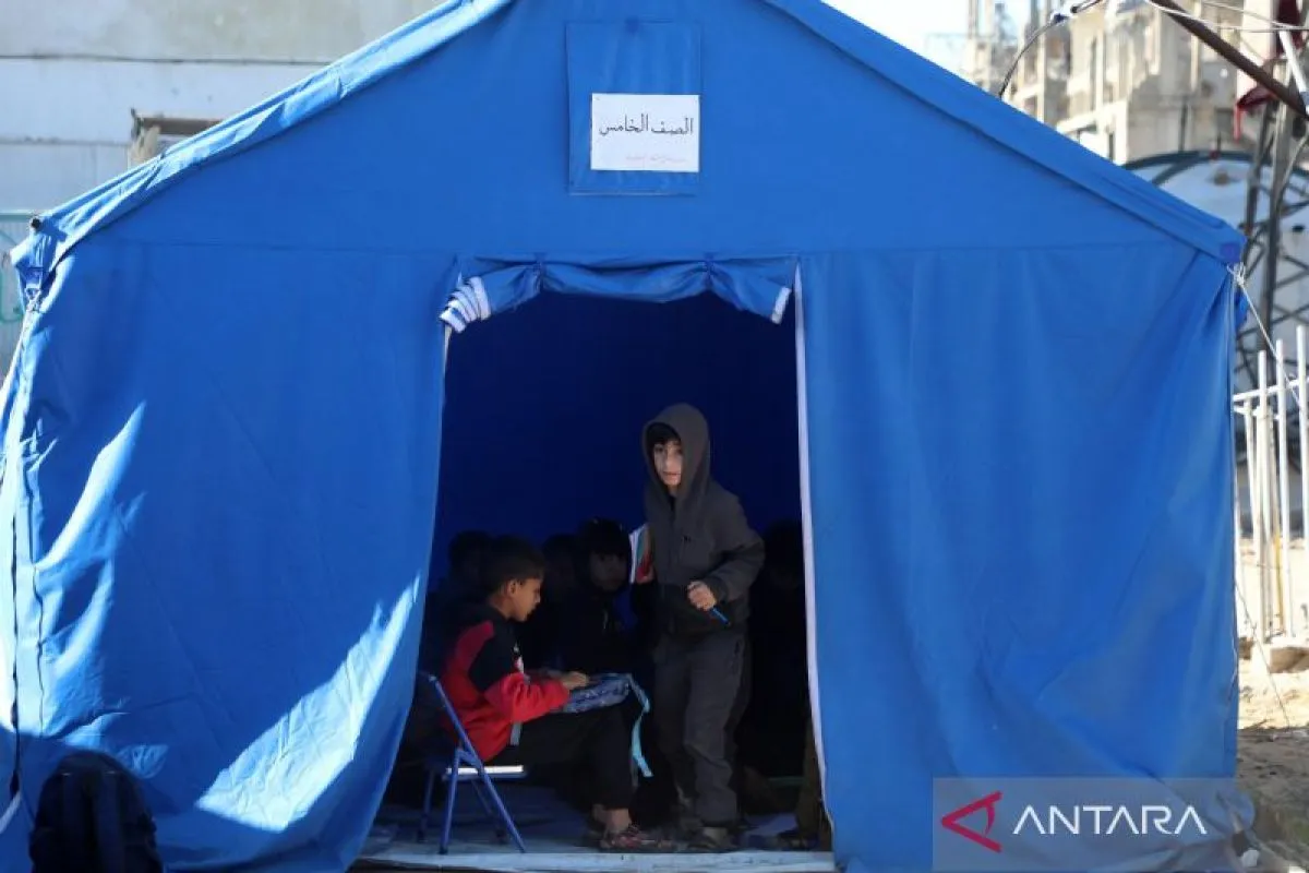 Siswa berada di dalam kelas Sekolah Al-Shamal Educational yang berjarak hanya 100 meter dari “Garis Kuning” (Yellow Line) di Kamp Pengungsi Jabalia, Jalur Gaza utara (ANTARA FOTO/Xinhua/Rizek Abdeljawad/sgd)