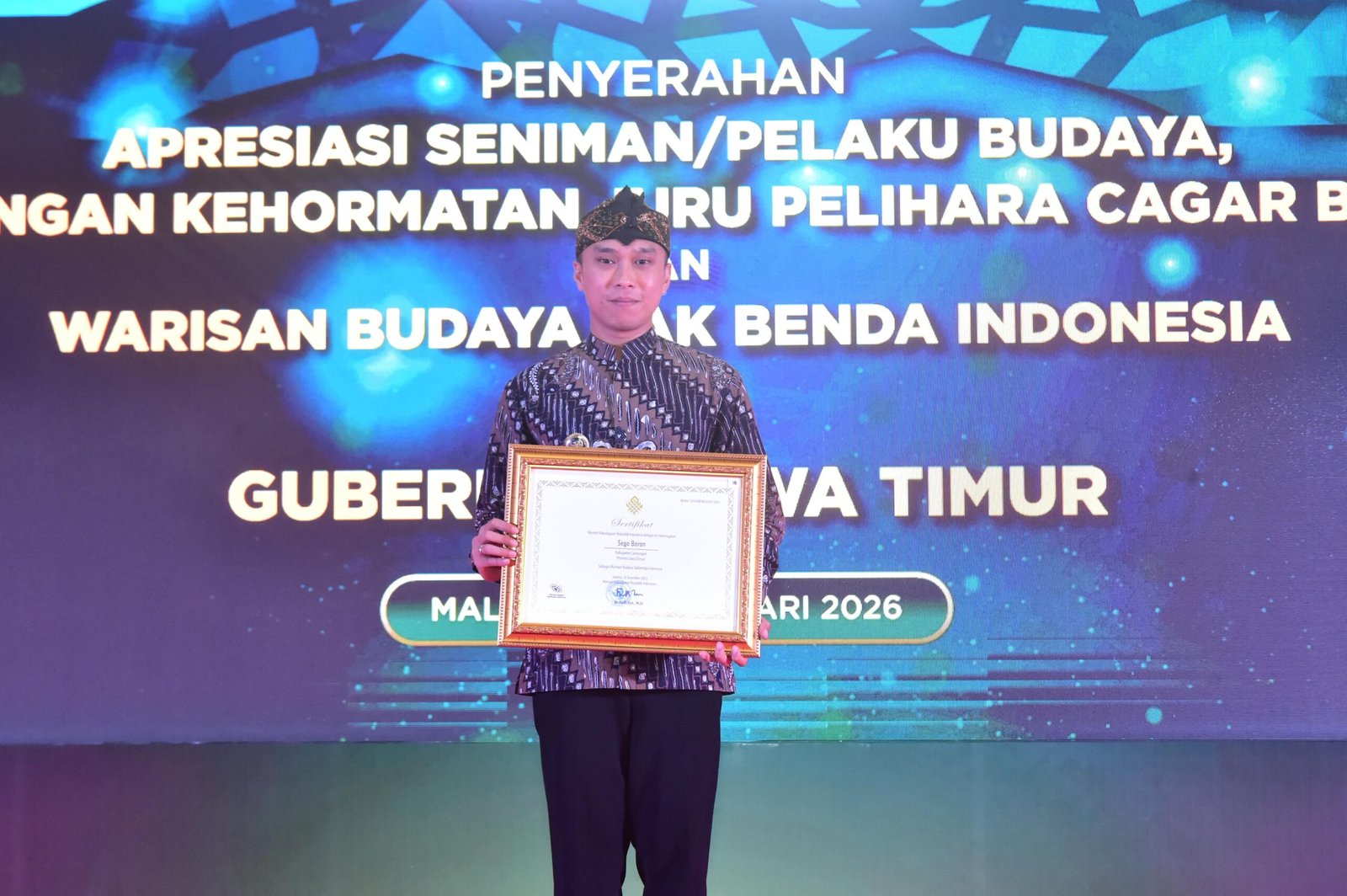 Wabup Lamongan Dirham Akbar Aksara menunjukkan sertifikat WBTb Indonesia. (Foto: Ist)