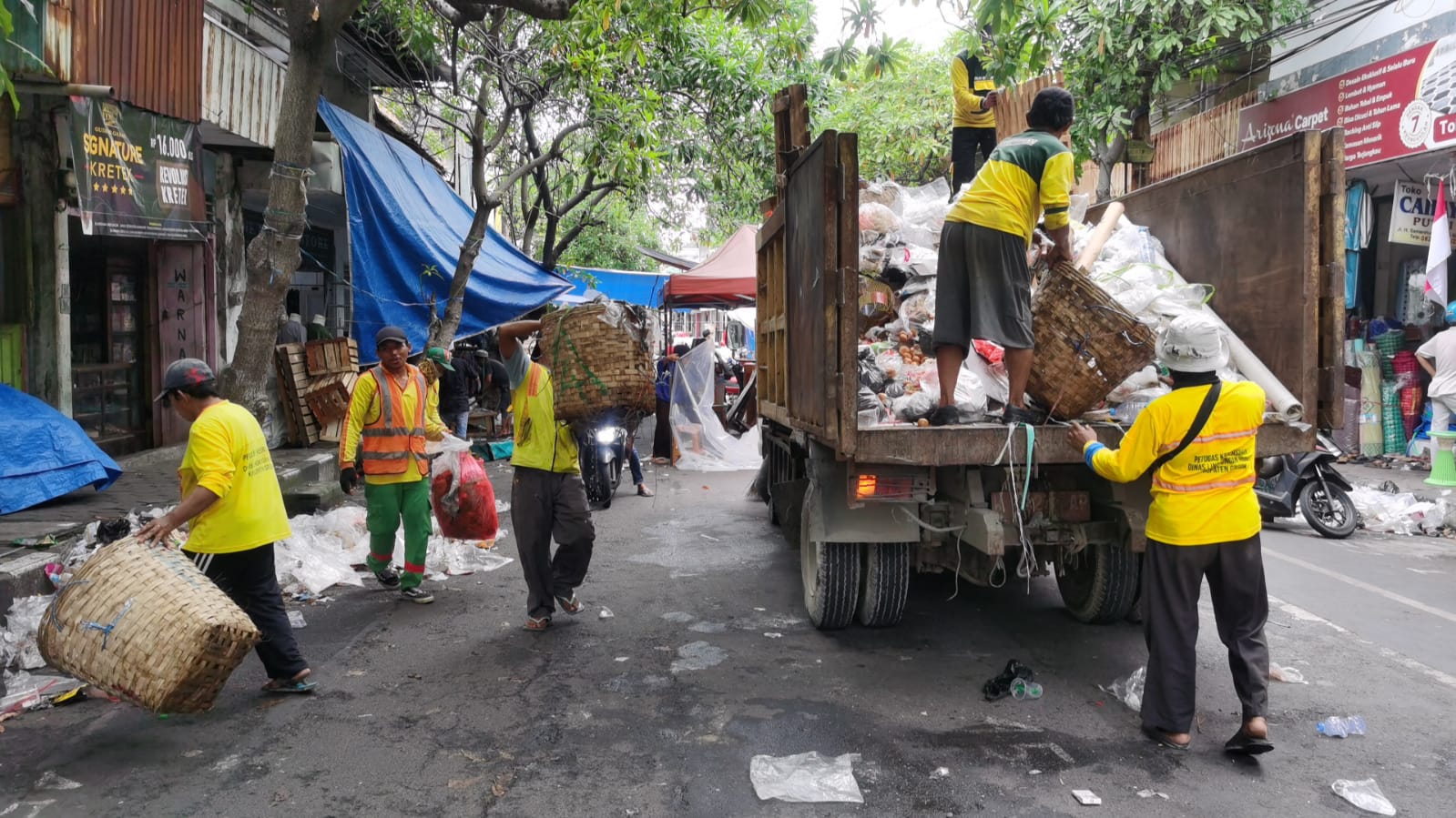 Petugas kebersihan DLH Gresik saat membersihkan sampah selepas event Pasar Bandeng Gresik. (Foto: Muhammad Wildan Zaky)