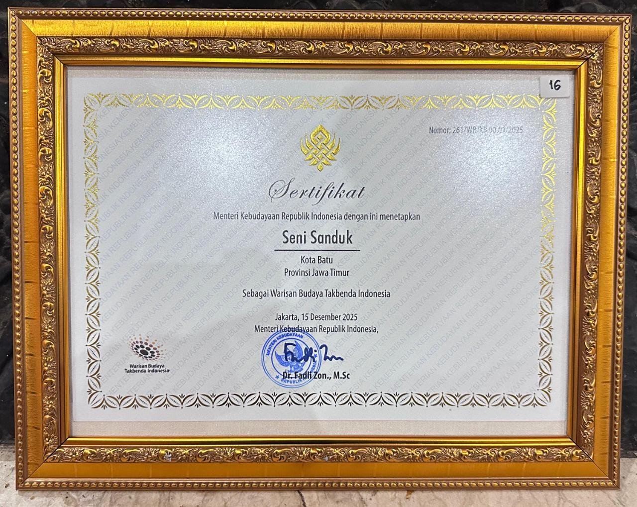 Seni Sanduk Resmi Jadi WBTb Indonesia, Wali Kota Batu Terima Sertifikat dari Gubernur Jatim