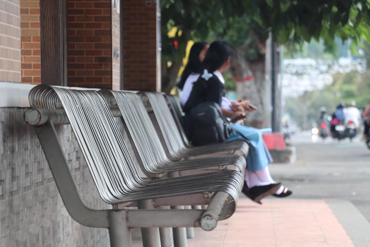Dua orang siswi berseragam tampak duduk sembari memainkan HP di Blitar. (Calvin BT)