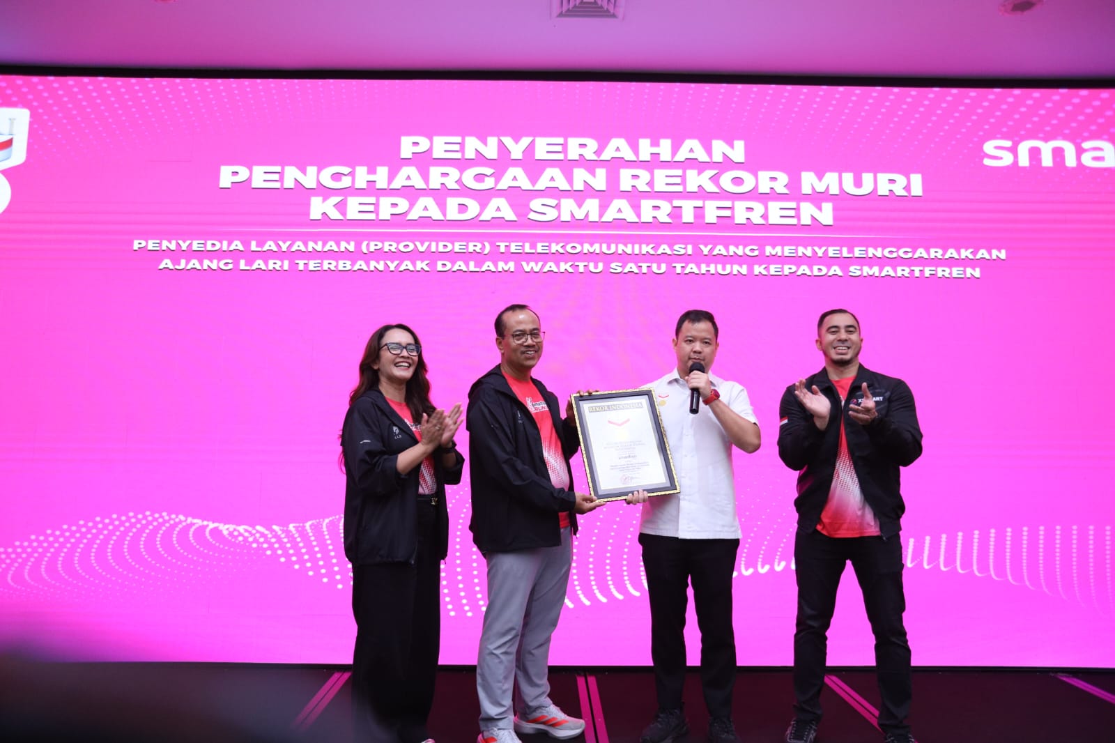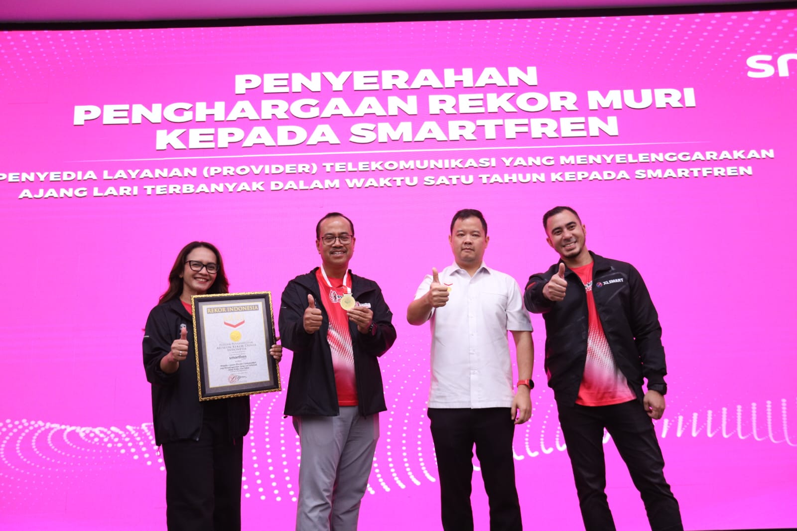 Turut hadir mendampingi Edtine Pamilien Gensana-Div Head Brand Communication SMARTFREN XLSMART, Sukaca Purwokardjono-Chief Marketing Officer SMARTFREN XLSMART, Osmar Semesta Susilo-Wakil Direktur Utama MURI dan Group Head Corporate Communication and sustainability XLSMART, Reza Mirza.