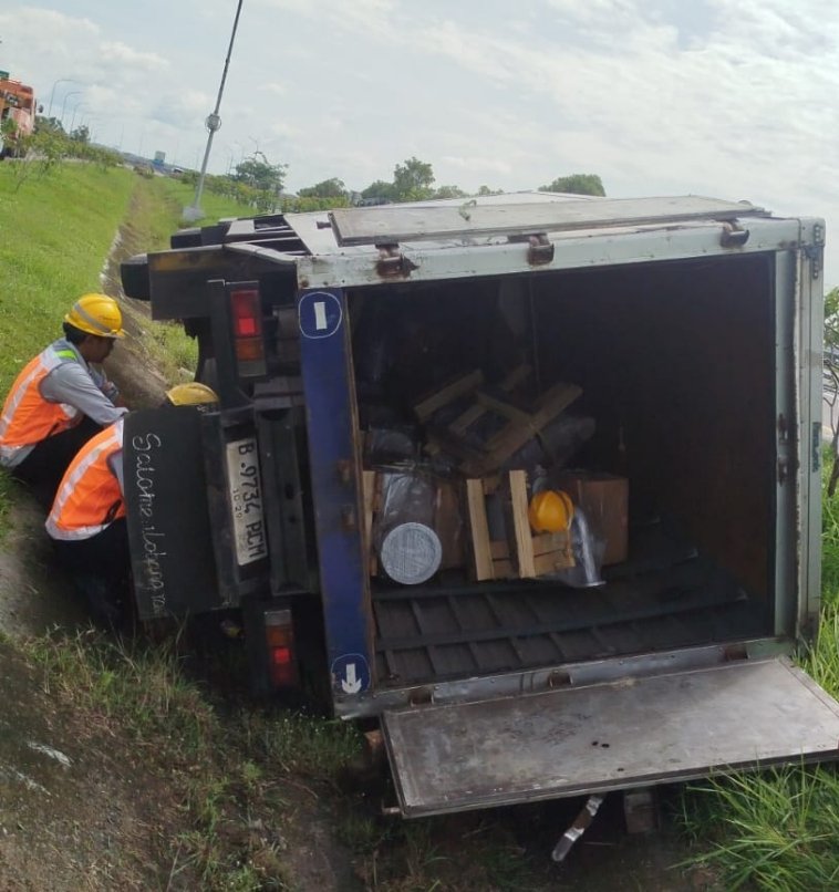“Kendaraan kemudian oleng ke kanan dan terperosok ke median atau parit tengah tol,” jelasnya.