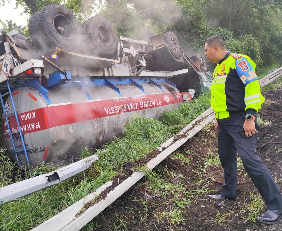 Di lokasi kejadian, nampak truk tangki menabrak pembatas ROW tol hingga kendaraan tersebut terbalik dan berhenti di sisi jalan tol. Posisi truk sempat menarik perhatian pengguna jalan yang melintas di sekitar lokasi.