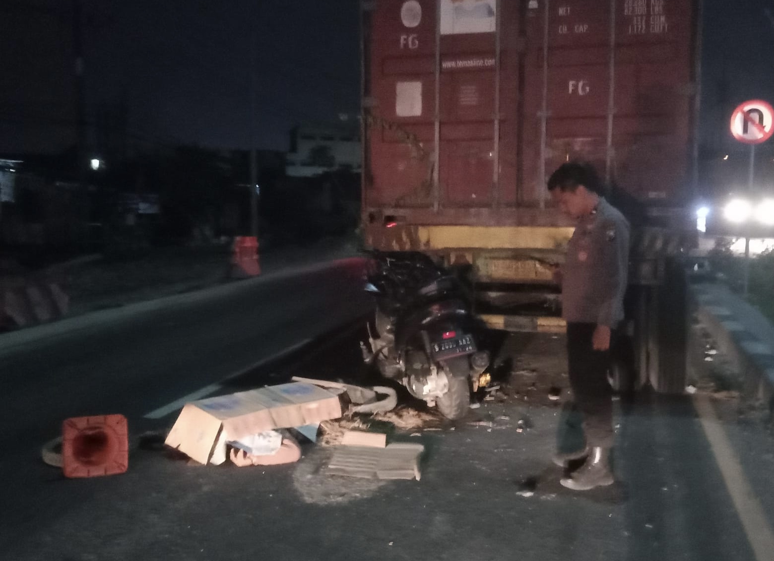 Benturan keras sepeda motor menabrak bagian belakang truk trailer mengakibatkan pengendara Erwin Nur Bani meninggal dunia di lokasi kejadian. Korban dievakuasi ke RSUD Ibnu Sina.