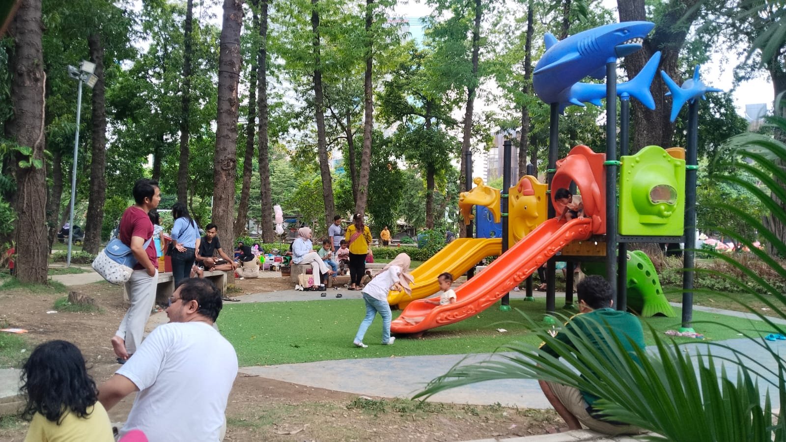 Taman yang dikenal dengan suasana asri di tepi sungai ini menjadi pilihan utama warga karena menawarkan akses masuk gratis dan beragam fasilitas yang ramah anak.