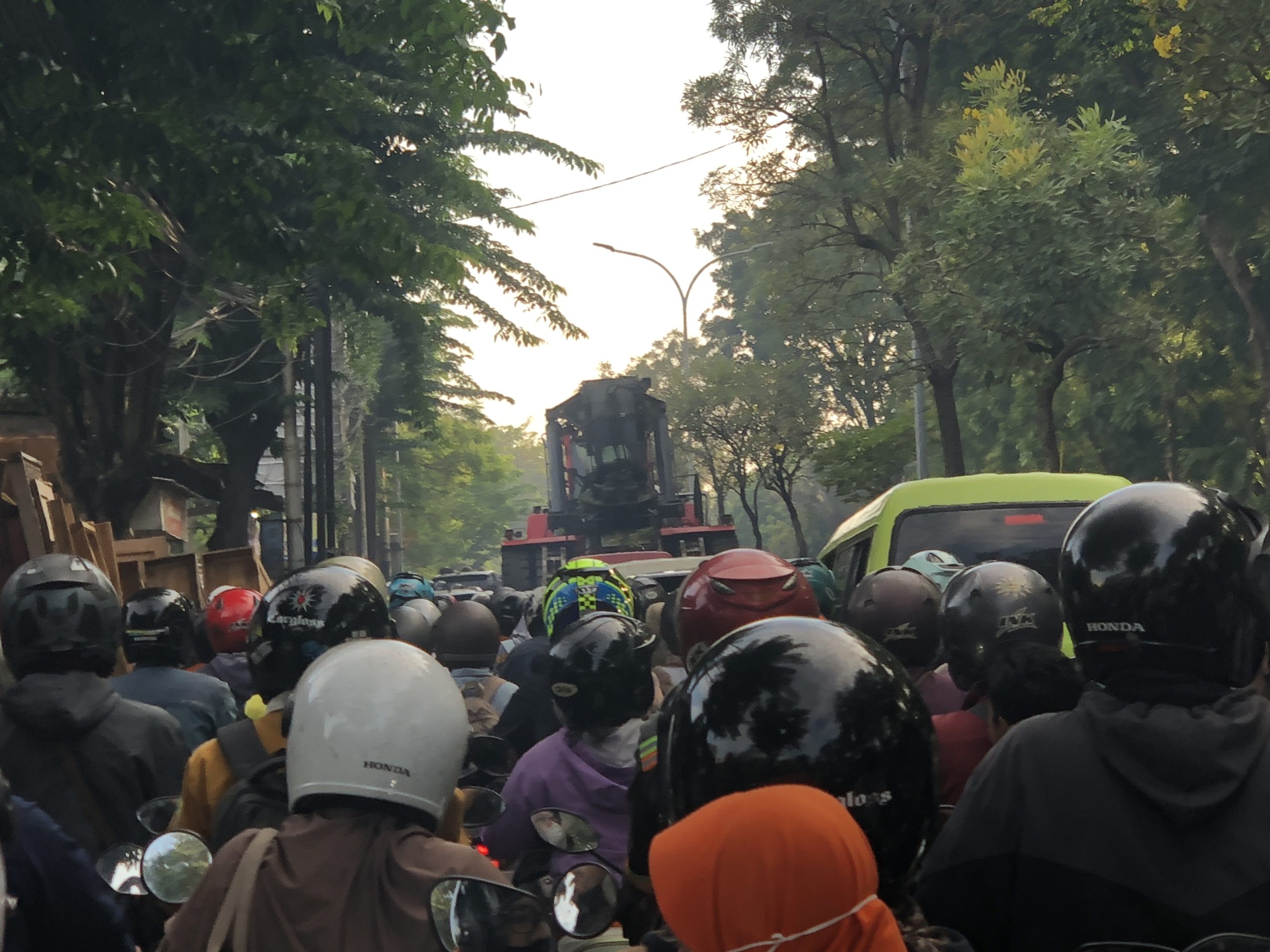Kemacetan semakin parah karena terjadi saat jam sibuk berangkat sekolah dan kerja. Tingginya volume kendaraan memicu lalu lintas tersendat parah.