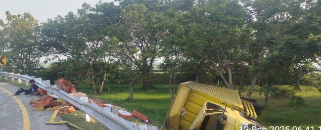 Nahas, saat melintas di lokasi kejadian, truk hilang kendali dan menghantam pembatas jalan hingga terguling masuk ke ROW (Right of Way) tol dalam posisi melintang menghadap ke barat.