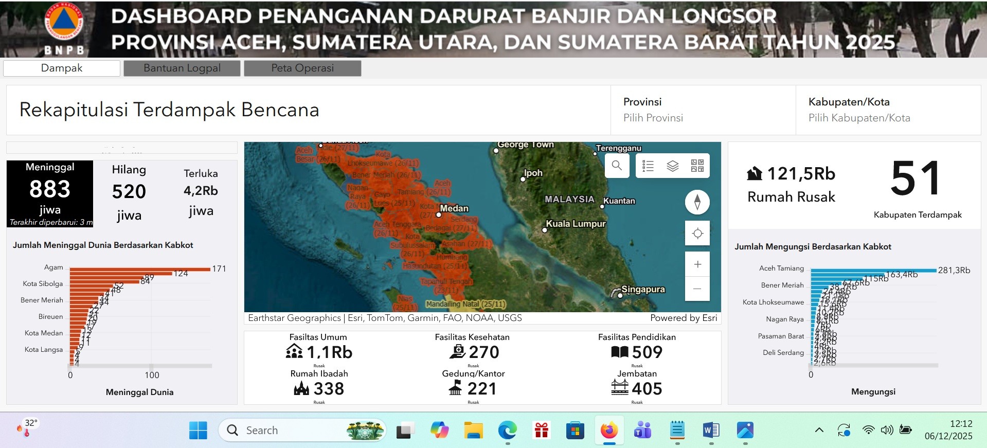 - Di Sumatera Barat, korban meninggal mencapai 226 orang, diikuti 213 hilang dan 112 luka-luka.