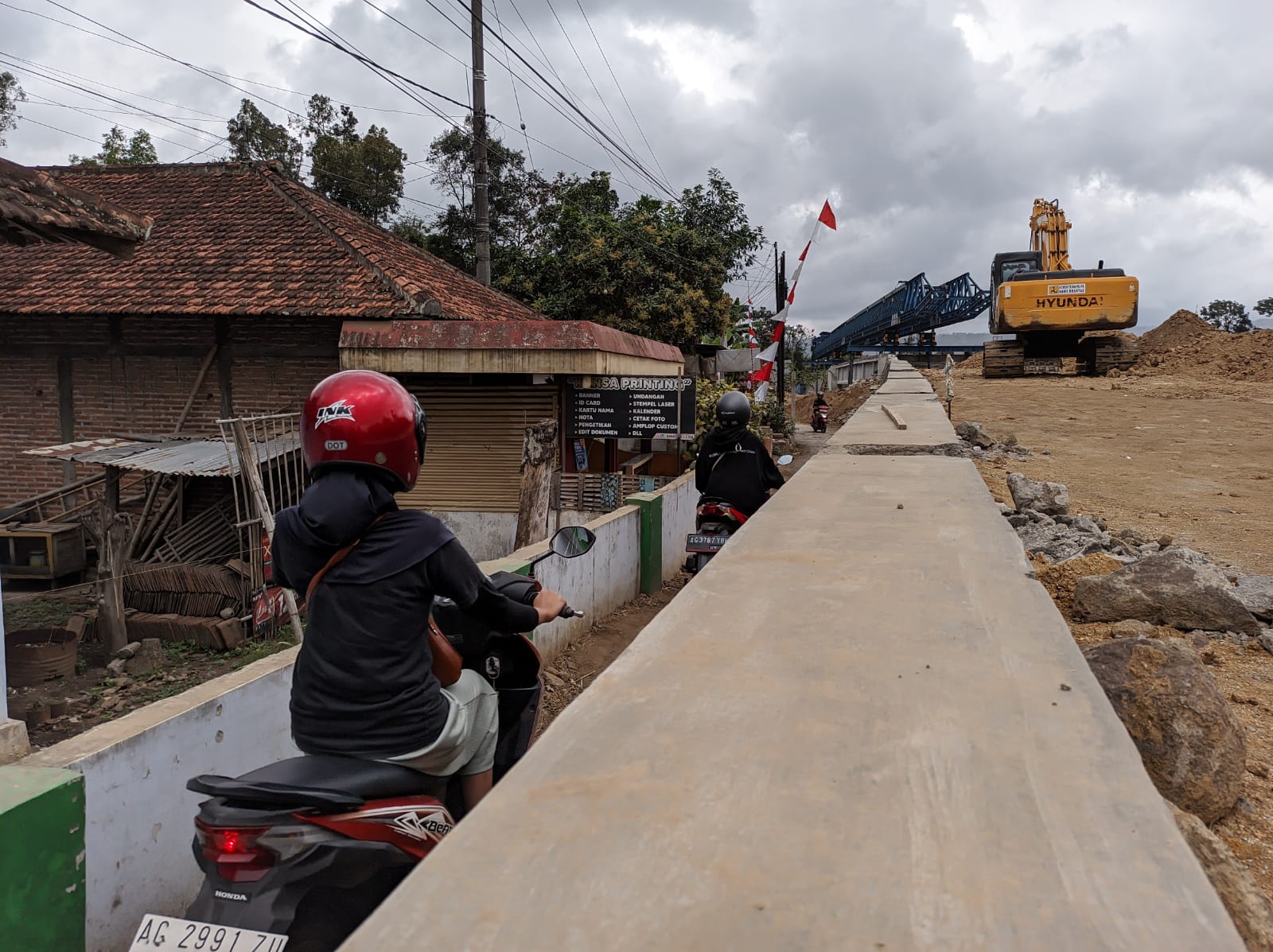 Kondisi pembangunan Jembatan Bendorejo yang dikeluhkan warga setempat.(herlambang)