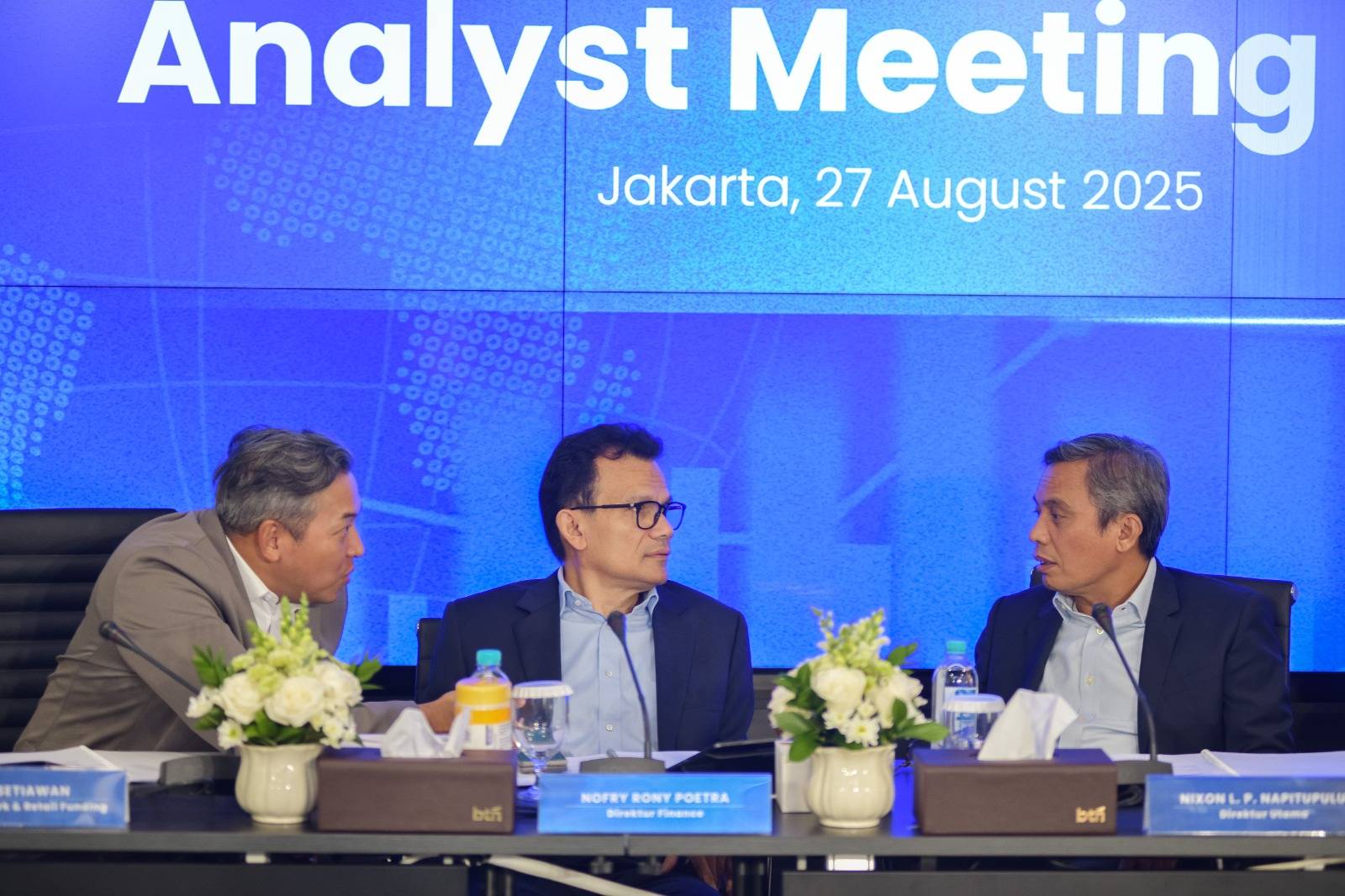 Direktur Utama BTN Nixon LP Napitupulu (tengah) didampingi Direktur Network & Retail Funding BTN Rully Setiawan (kiri), Direktur Finance & Strategy BTN Nofry Rony Poetra (kedua kiri), Direktur Risk Management BTN Setiyo Wibowo (kedua kanan), dan SEVP Digital Business BTN Thomas Wahyudi (kanan) kompak tersenyum sembari melihat laporan keuangan BTN Semester I/2025 di Menara 2 BTN, Jakarta, Rabu (27/8). Per 30 Juni 2025, BTN membukukan laba bersih sebesar Rp 1,7 triliun, naik 13,6 persen secara year-on-year (yoy) dibandingkan periode yang sama tahun lalu sebesar Rp 1,5 triliun. Peningkatan laba bersih tersebut ditopang oleh pendapatan bunga kredit yang naik 23,5 persen yoy menjadi Rp 18,50 triliun hingga Juni 2025 serta efisiensi proses bisnis di tengah tantangan makroekonomi. Penyaluran kredit dan pembiayaan BTN juga tercatat tumbuh 6,8 persen yoy menjadi Rp 376,11 triliun hingga semester I/2025, didukung oleh pertumbuhan kredit dan pembiayaan ke sektor perumahan dan non-perumahan. BTN juga mencatat pertumbuhan dana pihak ketiga sebesar 11,2 persen yoy menjadi Rp 406,38 triliun hingga semester I/2025, sejalan dengan upaya perseroan untuk memperkuat mesin pendanaan, terutama dana murah dan tidak terlepas dari upaya menggencarkan akusisi pengguna baru melalui aplikasi Bale by BTN.